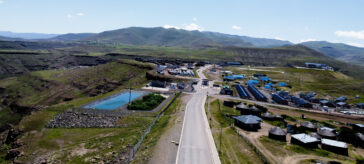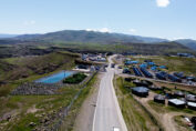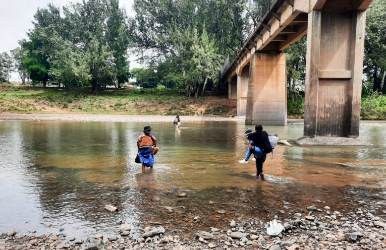A view of the Polihali Village gates shows a blue pond on the left, and just outside the fence, an area below the road used