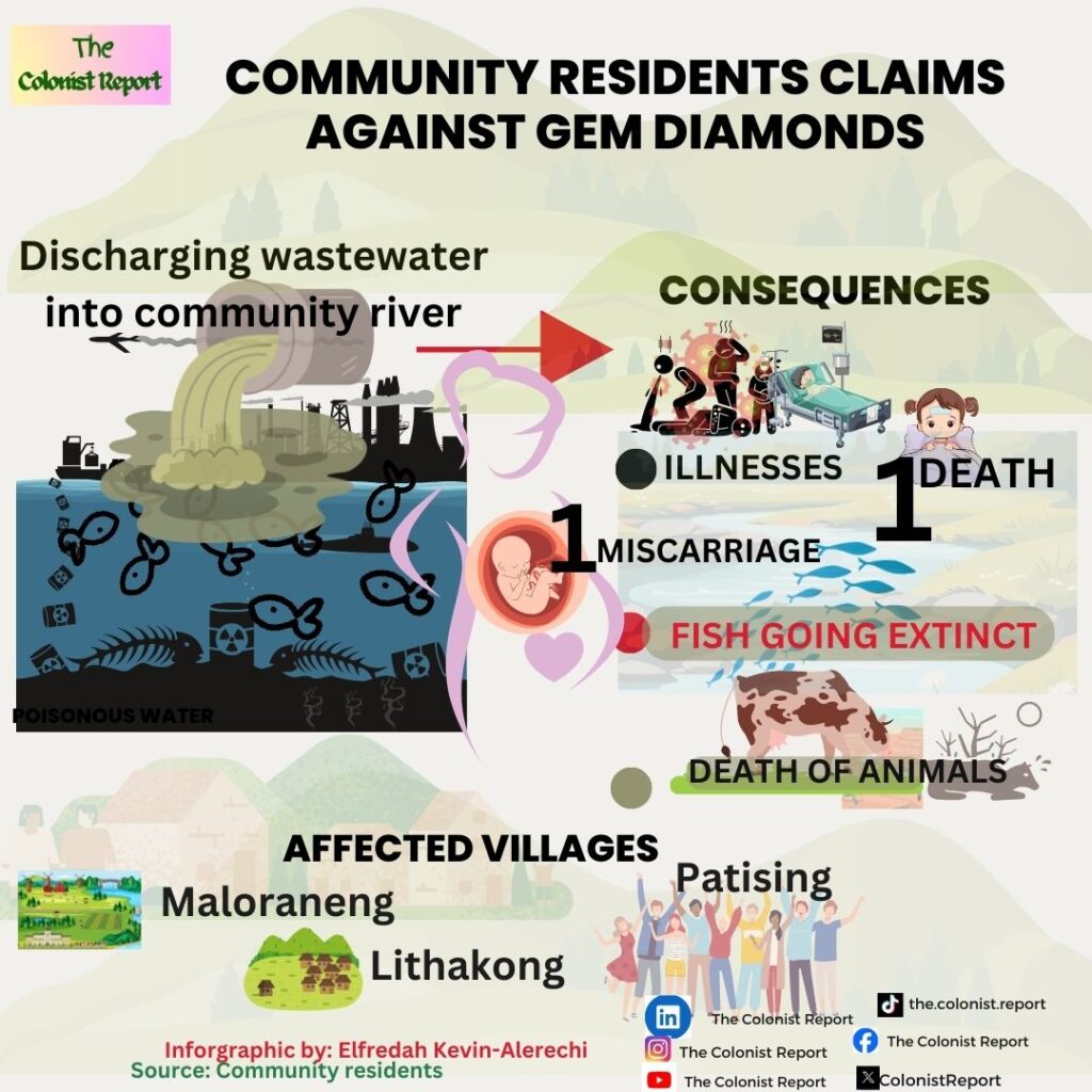 Gem Diamonds, in an email, denied that its wastewater was the cause of E.coli in the community river, and claimed that E.coli is caused by animals using the river. The company said it is aware of the nitrate level but has made efforts to reduce it.